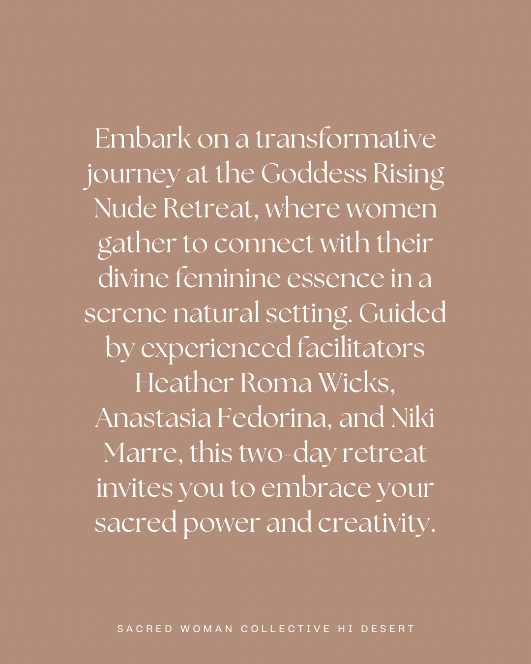 Embark on a transformative journey at the Goddess Rising Nude Retreat, where women gather to connect with their divine feminine essence in a serene natural setting. Guided by experienced facilitators Heather Roma Wicks, Anastasia Fedorina, and Niki Marre, this two-day retreat invites you to embrace your sacred power and creativity.
