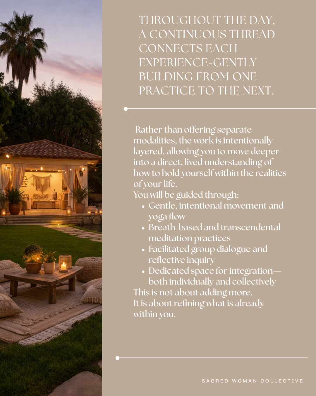 Throughout the day, you will be guided through a carefully woven progression of practices that include movement, breathwork, meditation, and facilitated inquiry. Each element is intentionally placed, creating a rhythm that allows you to not only experience—but to recognize, reflect, and integrate.