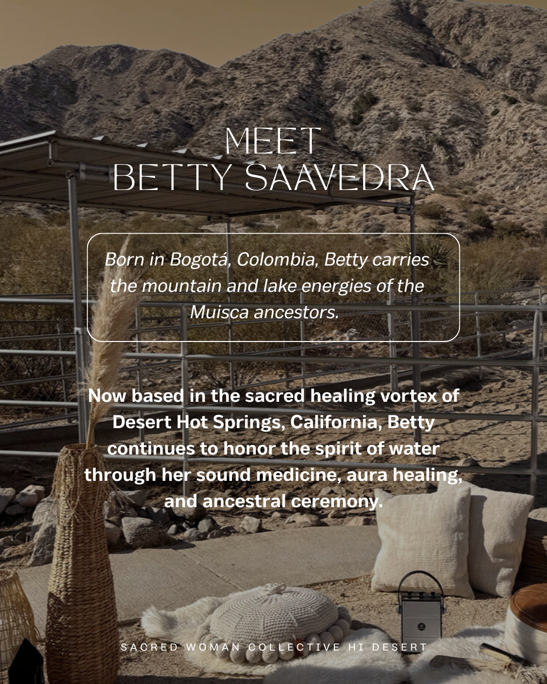 Now based in the sacred healing vortex of Desert Hot Springs, California, Betty honors the spirit of water through her sound medicine, aura healing, and ancestral ceremonies. She affectionately refers to Desert Hot Springs as “Spa City,” a living temple of mineral waters and desert light.