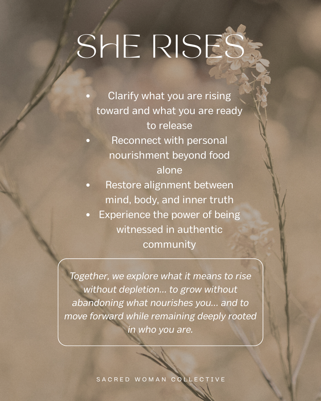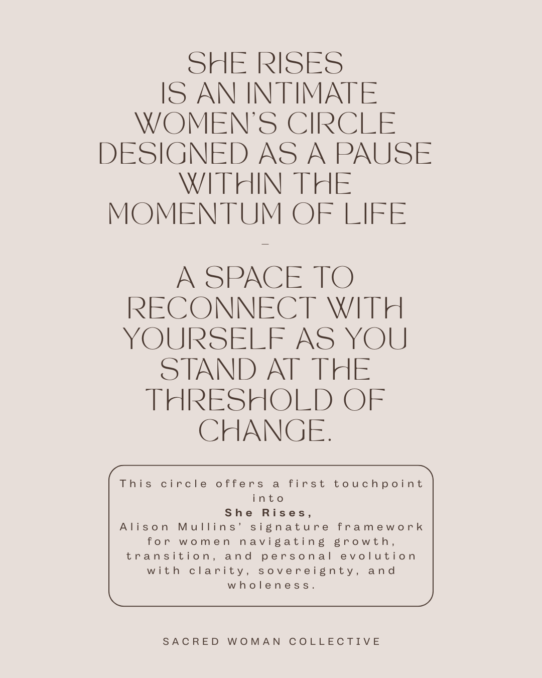 This circle serves as a sacred touchpoint into the She Rises signature program — an experiential introduction to the practices, reflections, and conversations that support women in rising with intention rather than exhaustion.