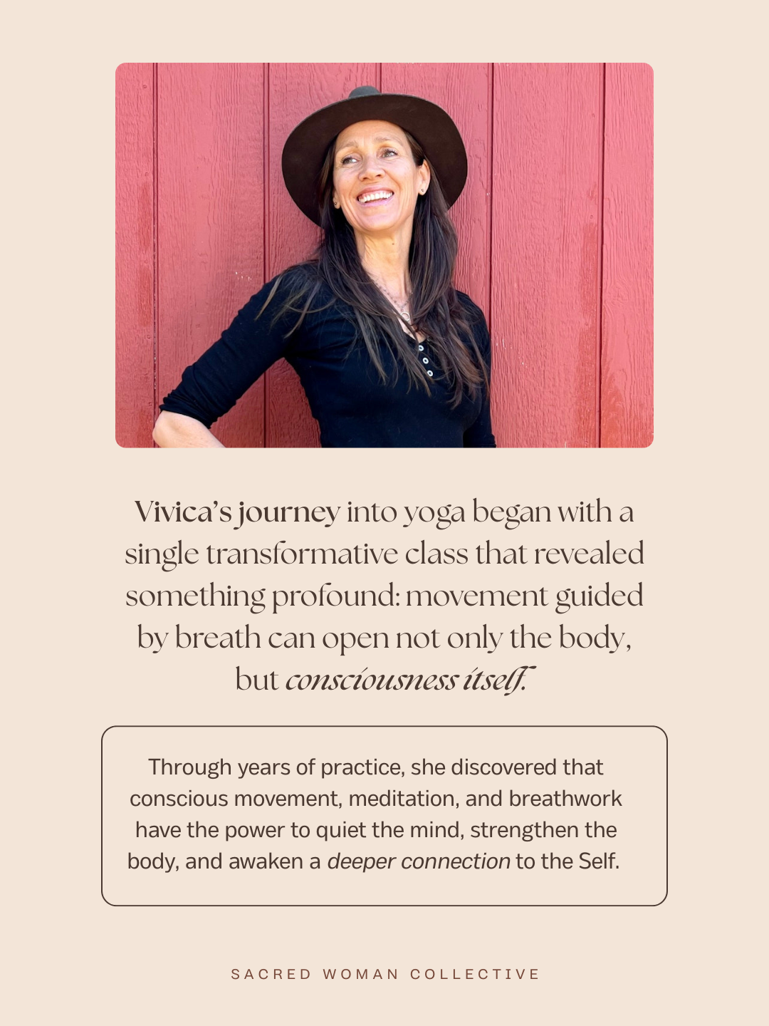 Through years of practice, she discovered that conscious movement, meditation, and breathwork have the power to quiet the mind, strengthen the body, and awaken a deeper connection to the Self. Today Vivica shares this path with others through yoga, meditation, Ayurveda, strength training, and courses dedicated to the transformative power of breath. Her teaching invites students to move from the inside out, cultivating presence, clearing energetic blockages, and reconnecting with the innate intelligence of the body.